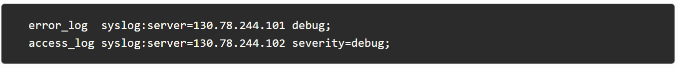NGINX 文档中提供了更多选项 。最后,我要补充一点,您还可以使用 Syslog 作为替代方案,它需要一个 syslog: 前缀,然后指定一个服务器(通过 IP、UNIX 套接字或域)。