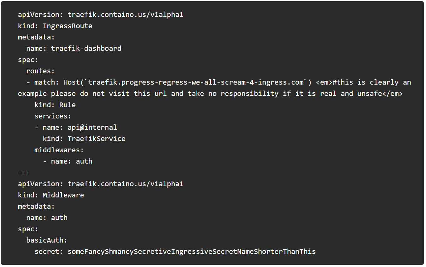然后,您将为 Kubernetes 和其他容器编排器或基础设施管理器(Docker Swarm、Docker 等)提供不同的配置选项。当然,让我们展示一个基于 Traefik 文档的 Kubernetes CRD 示例(在 YAML 中) :